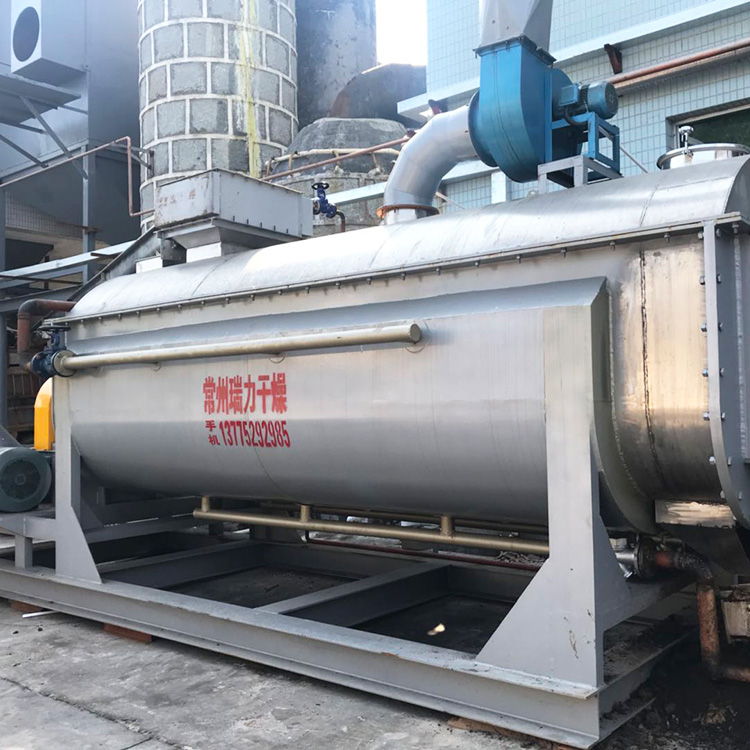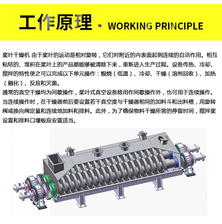 產(chǎn)品描述:空心軸上密集排列著楔型中空漿葉,熱介質(zhì)經(jīng)空心軸流經(jīng)漿葉。單位有效容積內(nèi)傳熱面積很大,熱介質(zhì)溫度從-40℃到320℃,可以是水蒸汽,也可以是液體型:如熱水、導熱油等。間接傳導加熱,沒有攜帶空氣帶走熱量,熱量均用來加熱物料。