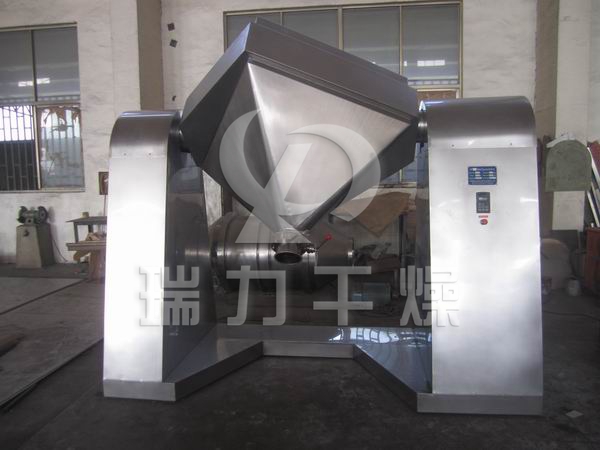 將物料裝入方錐形密閉混合桶內(nèi),料斗對(duì)稱的軸線與回轉(zhuǎn)軸軸線成一夾角,不同組分物料在密閉的料斗中進(jìn)行三維空間運(yùn)動(dòng),產(chǎn)生強(qiáng)烈翻轉(zhuǎn)和擴(kuò)散收縮作用,達(dá)到好的混合效果。