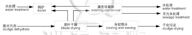 (2)熱源產(chǎn)生??墒褂脽嵴羝驘嵊妥鳛闊峤粨Q的熱源。一般熱流體的溫度為180℃-200℃。熱介質(zhì)分別被引入中空的干燥機(jī)殼體和轉(zhuǎn)動(dòng)的軸槳葉等所有與污泥接觸進(jìn)行熱交換的加熱金屬表面。