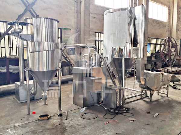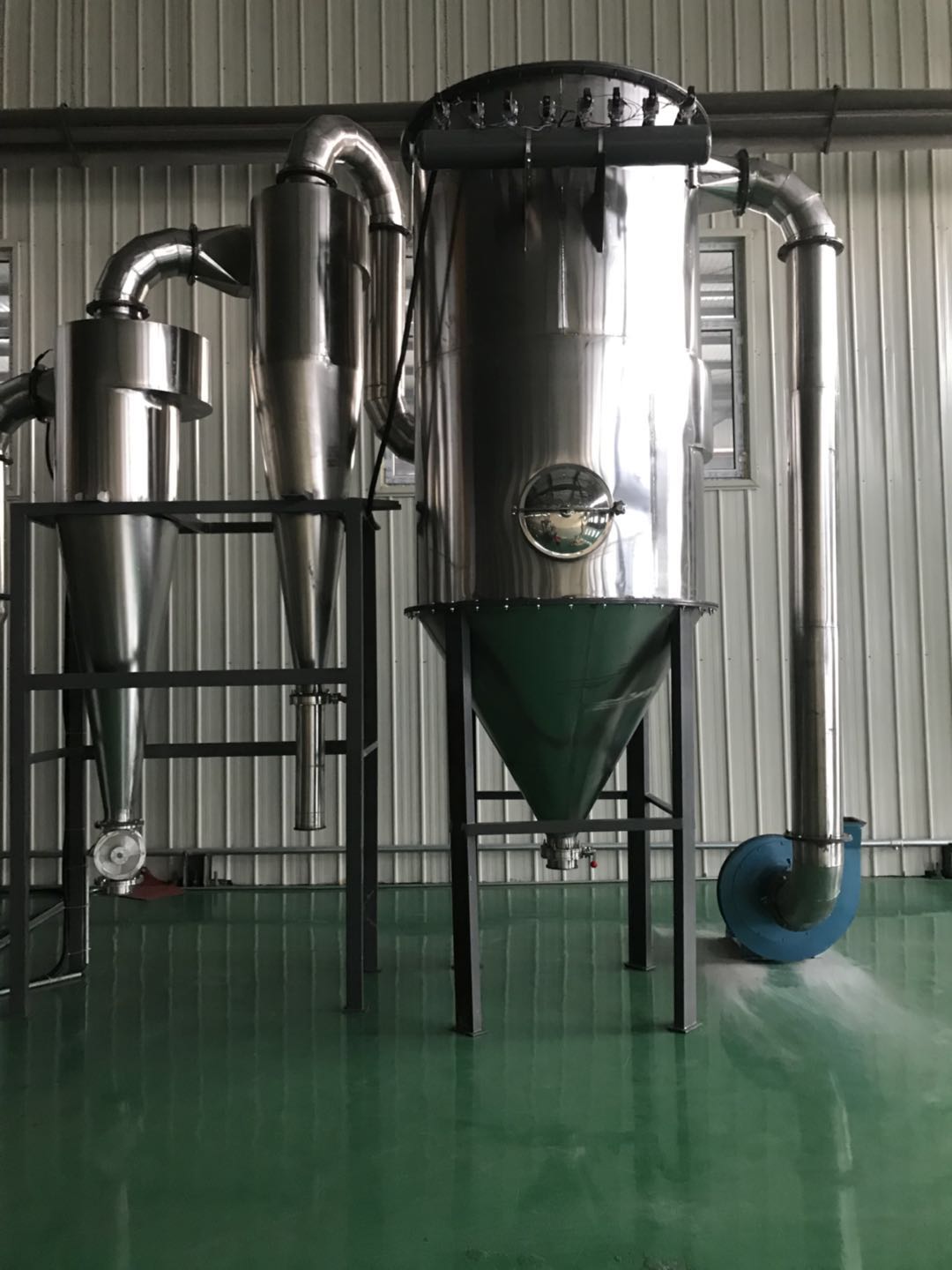 血漿血球蛋白粉是由供料系統(tǒng)、介質(zhì)循環(huán)系統(tǒng)、空氣加熱凈化系統(tǒng)、干燥塔系統(tǒng)、收料系統(tǒng)、控制系統(tǒng)等多個(gè)系統(tǒng)整合而成。主塔系統(tǒng)集中了目前噴霧干燥工程的所有尖端技術(shù),噴干機(jī)組的收料系統(tǒng)由一級(jí)旋風(fēng)分離器+布袋除塵器組合形成。一級(jí)旋風(fēng)采用高氣量高效率旋風(fēng)進(jìn)行收集,其收粉率能達(dá)到96%左右分,而布袋除塵器是針對(duì)蛋白粉類(lèi)除塵專(zhuān)門(mén)設(shè)計(jì)的優(yōu)化設(shè)備,能使物料與風(fēng)進(jìn)行完全分離并沉降,布袋為拒水防油防靜電布袋,過(guò)濾目數(shù)可達(dá)500目以上。