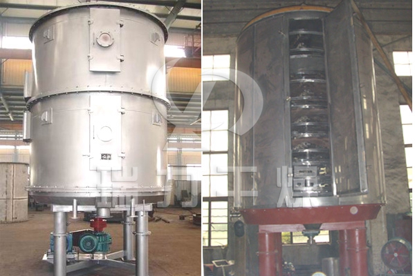 濕物料自加料器連續(xù)地加到干燥器上部第一層干燥盤上,帶有耙葉的耙臂作回轉(zhuǎn)運(yùn)動(dòng)使耙臂作回轉(zhuǎn)運(yùn)動(dòng)使耙葉連續(xù)地翻抄物料。物料沿指數(shù)螺旋線流過干燥盤表面,在小干燥盤上的物料被移送到外緣,并在外緣落到下方的大干燥盤外緣,在大干盤上物料向里移動(dòng)并從中間落料口落如下一層小干燥盤中。大小干燥盤上下交替排列,物料得以連續(xù)地流過整個(gè)干燥器。中空的干燥盤內(nèi)通入加熱介質(zhì),加熱介質(zhì)形式有飽和蒸汽、熱水和導(dǎo)熱油,加熱介質(zhì)由干燥盤的一端進(jìn)入,從另一端導(dǎo)出。已干物料從最后一層干燥盤落到殼體