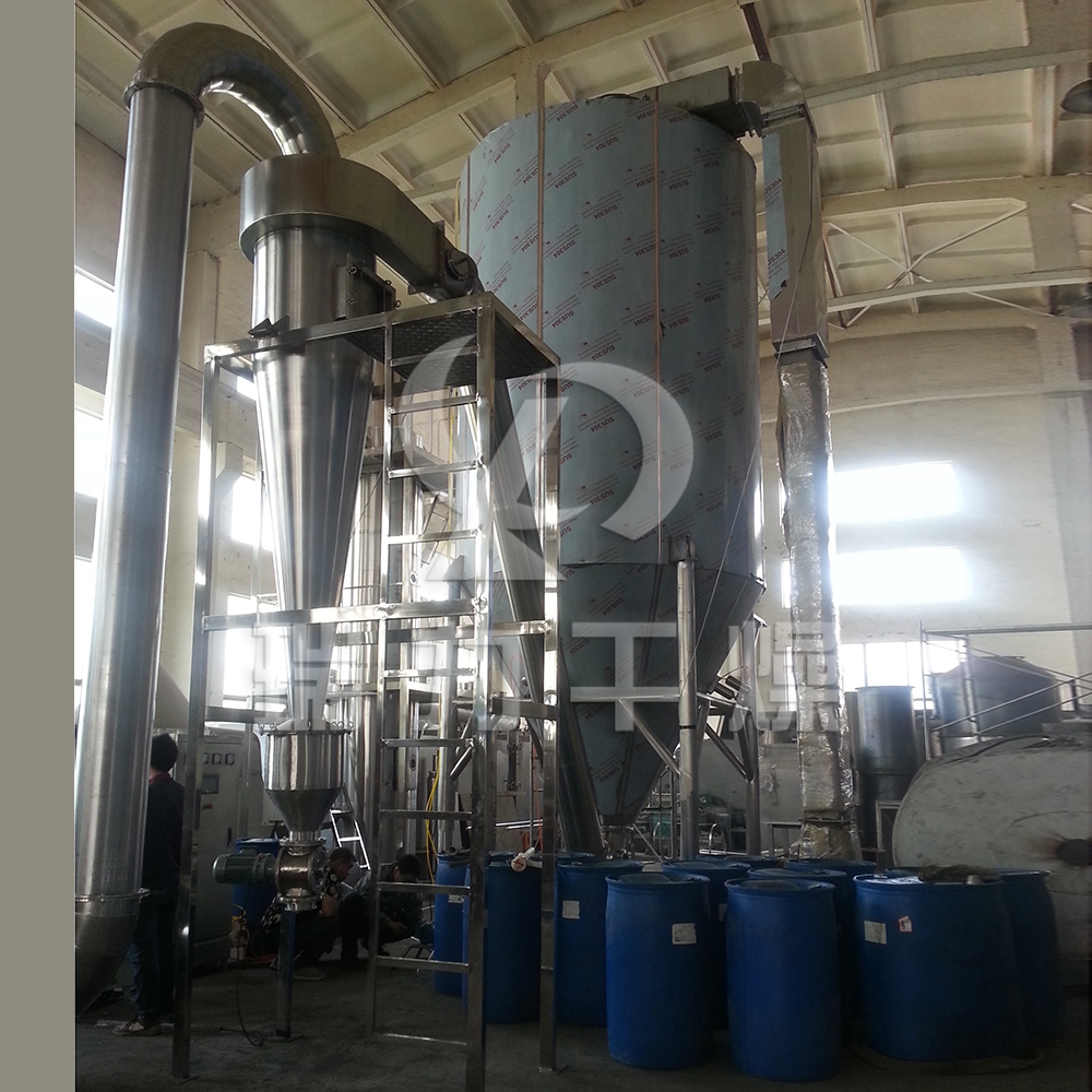 該生產(chǎn)線由供料系統(tǒng)、介質(zhì)循環(huán)系統(tǒng)、空氣加熱凈化系統(tǒng)、干燥塔系統(tǒng)、收料系統(tǒng)、控制系統(tǒng)等多個(gè)系統(tǒng)整合而成。主塔系統(tǒng)集中了目前噴霧干燥工程的所有尖端技術(shù),噴干機(jī)組的收料系統(tǒng)由一級(jí)旋風(fēng)分離器+布袋除塵器組合形成。一級(jí)旋風(fēng)采用高氣量高效率旋風(fēng)進(jìn)行收集,其收粉率能達(dá)到96%左右分,而布袋除塵器是針對(duì)蛋白粉類除塵專門設(shè)計(jì)的優(yōu)化設(shè)備,能使物料與風(fēng)進(jìn)行完全分離并沉降,布袋為拒水防油防靜電布袋,過(guò)濾目數(shù)可達(dá)500目以上。