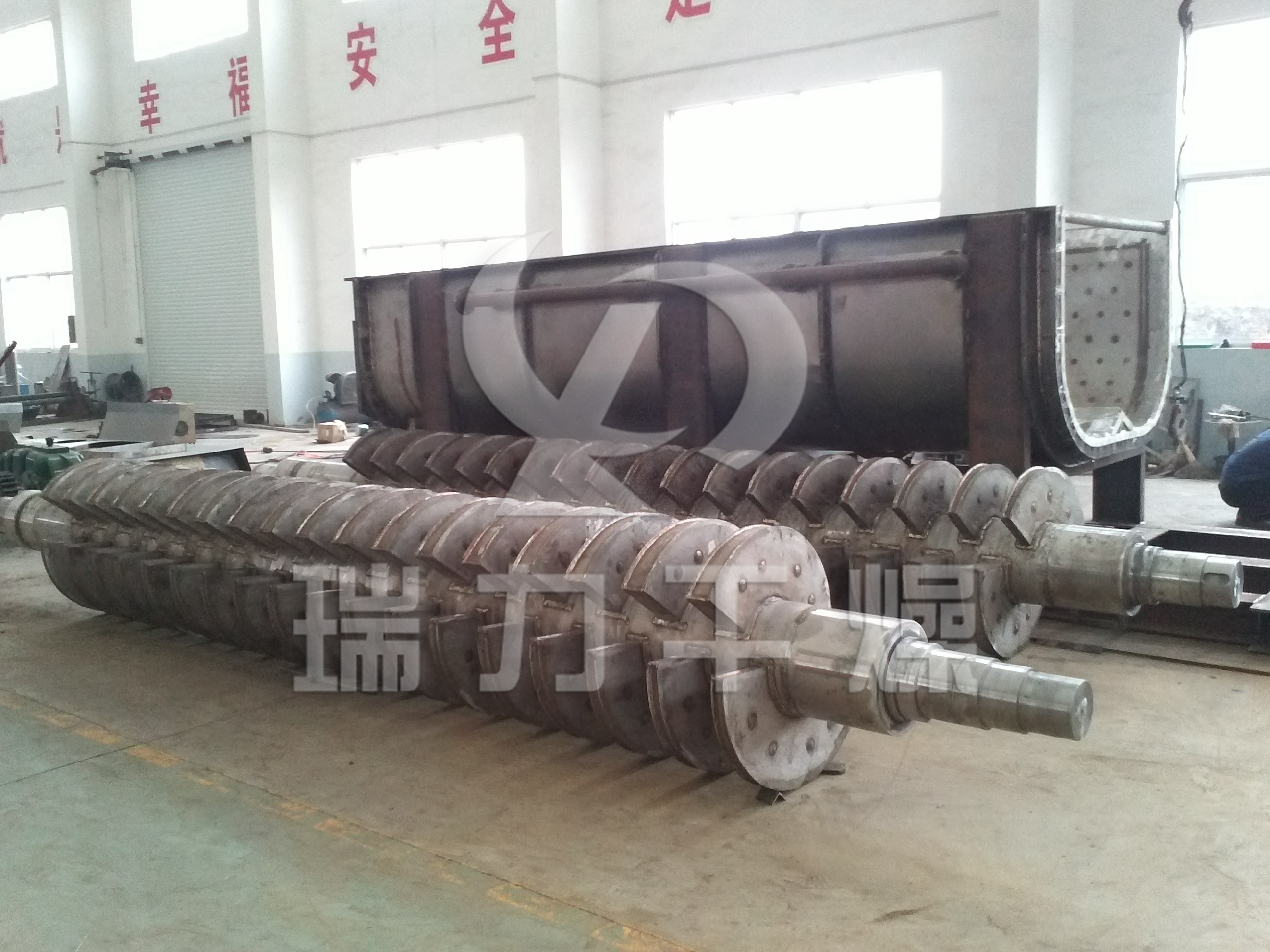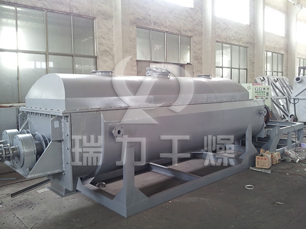 空心軸上密集排列著楔型中空漿葉,熱介質(zhì)經(jīng)空心軸流經(jīng)漿葉。單位有效容積內(nèi)傳熱面積很大,熱介質(zhì)溫度從-40℃到320℃,可以是水蒸汽,也可以是液體型:如熱水、導熱油等。間接傳導加熱,沒有攜帶空氣帶走熱量,熱量均用來加熱物料。熱量損失僅為通過器體保溫層向環(huán)境的散熱。楔型漿葉傳熱面具有自清潔功能。物料顆粒與楔型面的相對運動產(chǎn)生洗刷作用,能夠洗刷掉楔型面上附著物料,使運轉(zhuǎn)中一直保持著清潔的傳熱面。漿葉干燥機的殼體為Ω型,殼體內(nèi)一般安排二到四根空心攪拌軸。殼體有密封端蓋與上蓋,防止物料粉塵外泄而充分發(fā)揮作用。